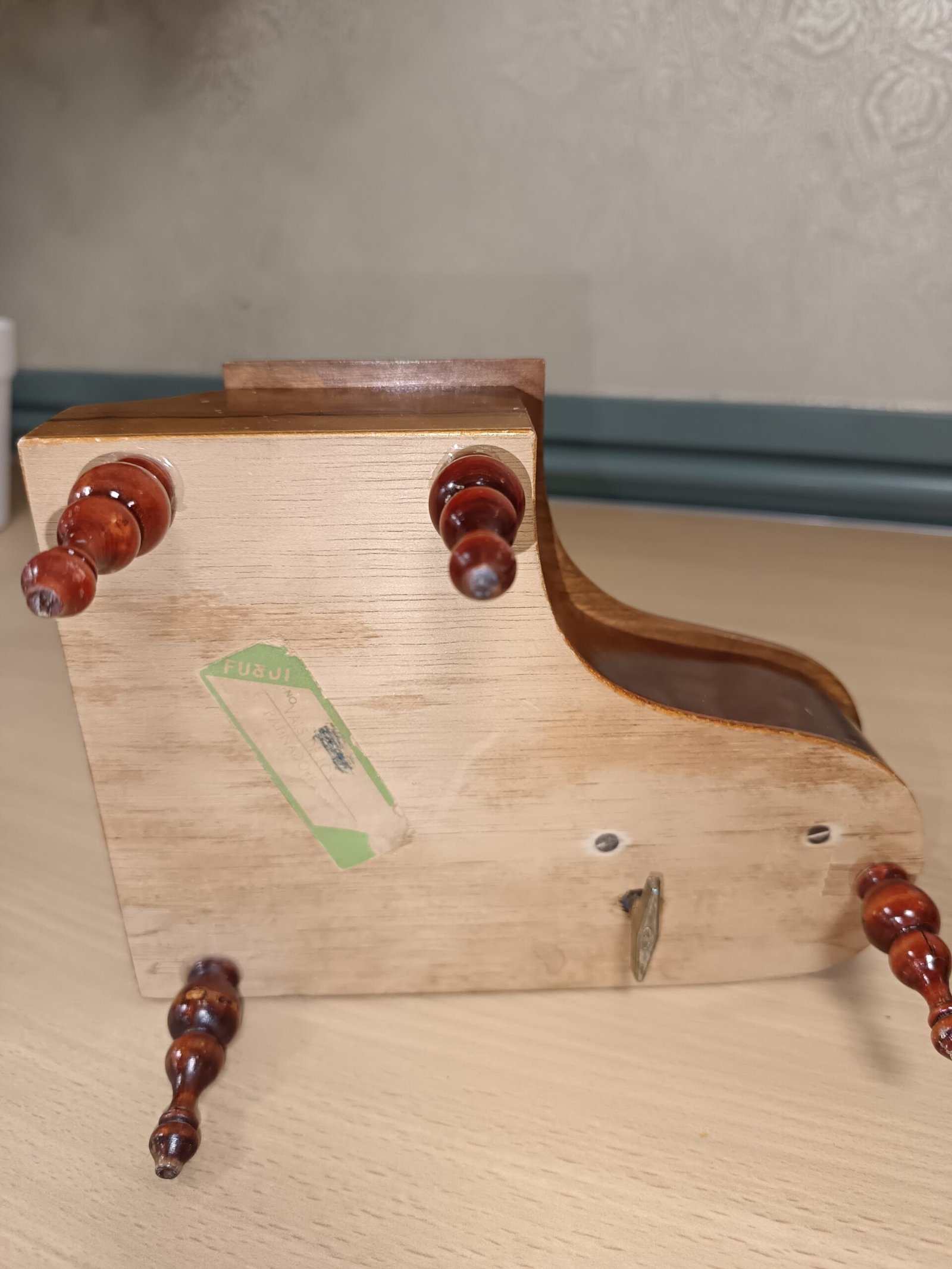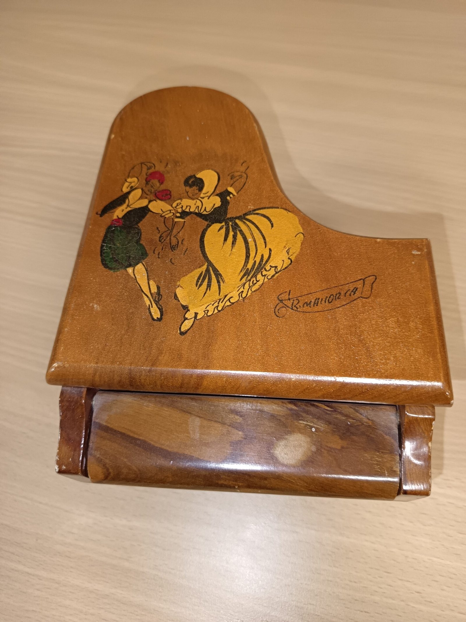 A piano music box to keep jewellery and other small mementos safe. The music is by wound up and is in good tune.