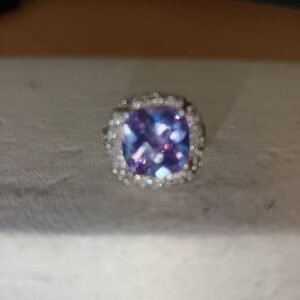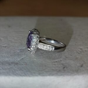 Light lavender amethyst in a halo os silver and zirconia finish.
